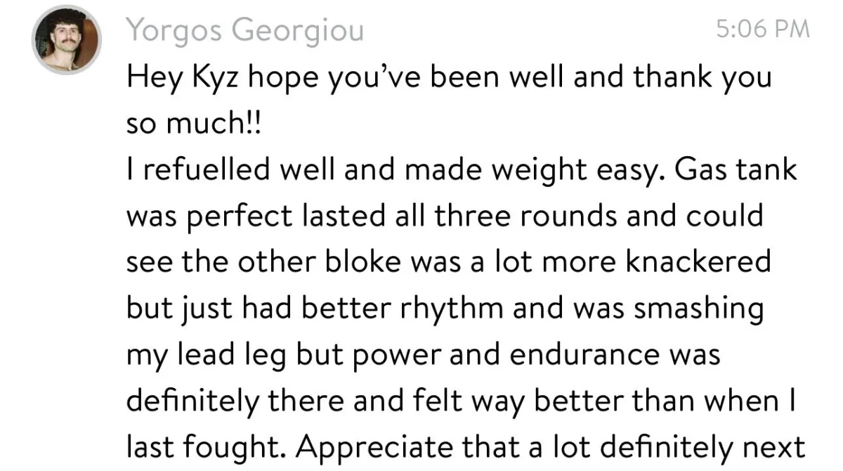 How 200+ martial artists in the last year have built massive gas tanks, explosive power, nutrition strategies that make fight week safer, and daily life more tolerable with 1-on-1 online coaching, testing and custom support.